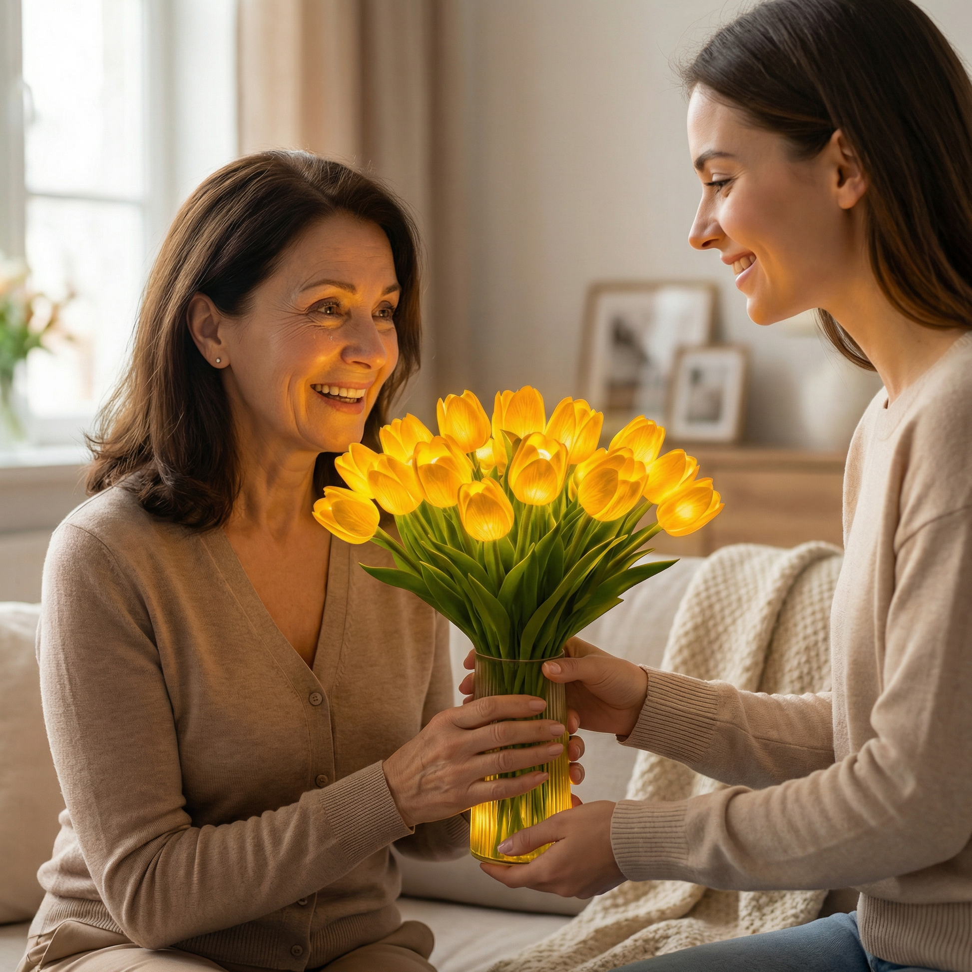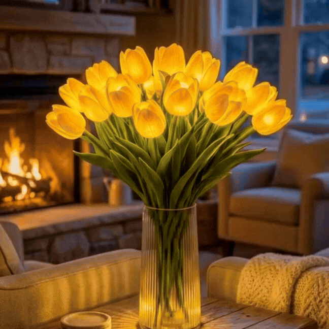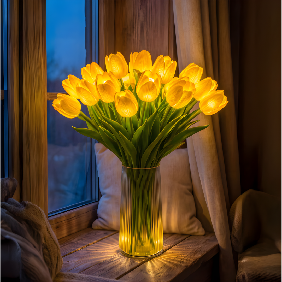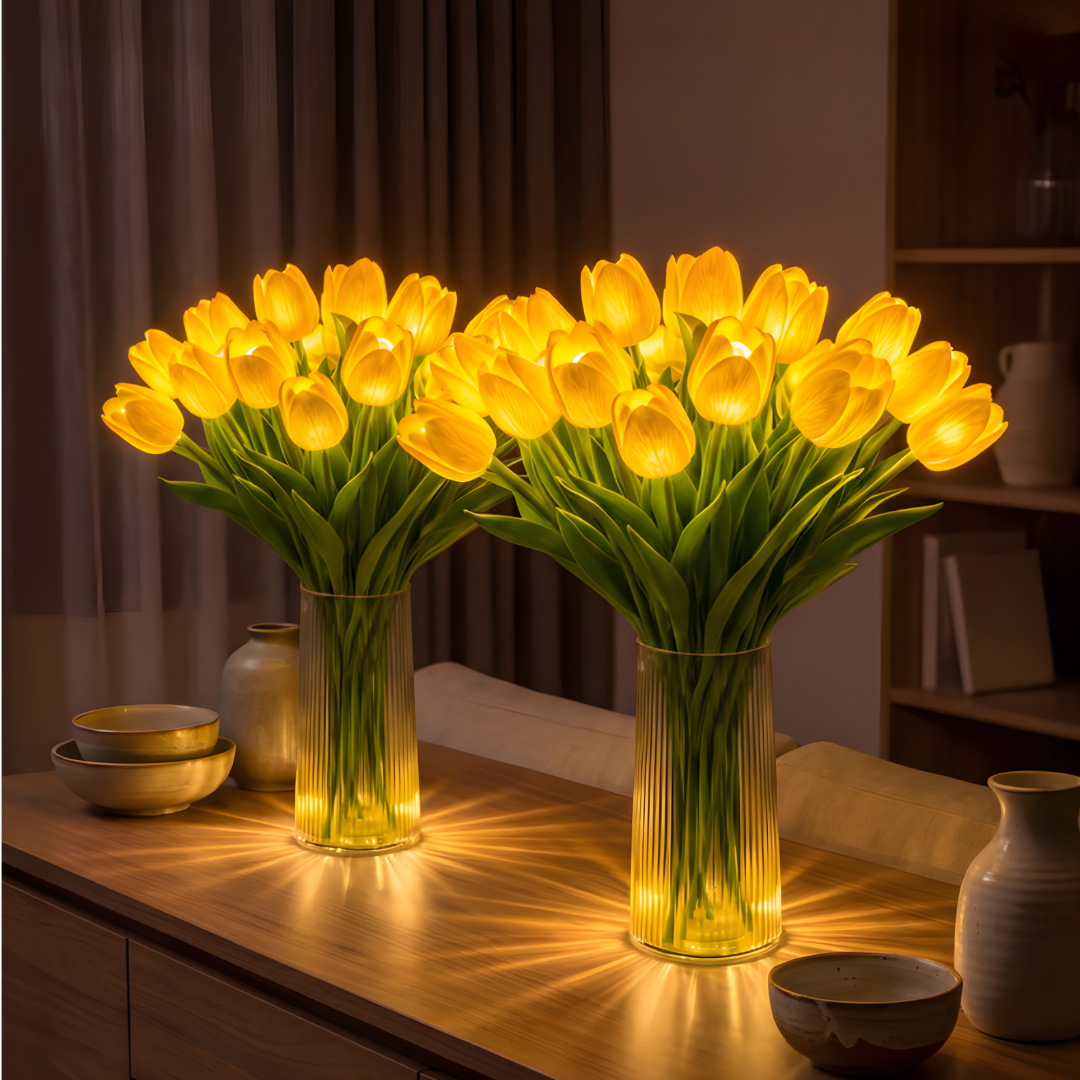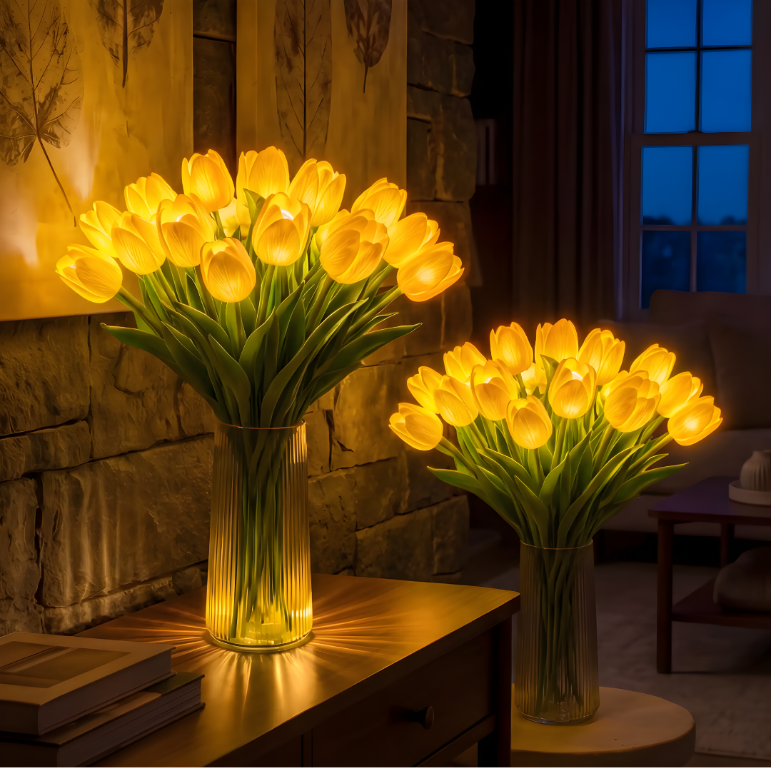 W jasnym świetle Lampa Wieczny Bukiet™ wygląda jak prawdziwy, świeżo ścięty bukiet tulipanów. Elegancka dekoracja sypialni, salonu, kuchni czy biurka — zawsze piękna, bez podlewania i pielęgnacji.