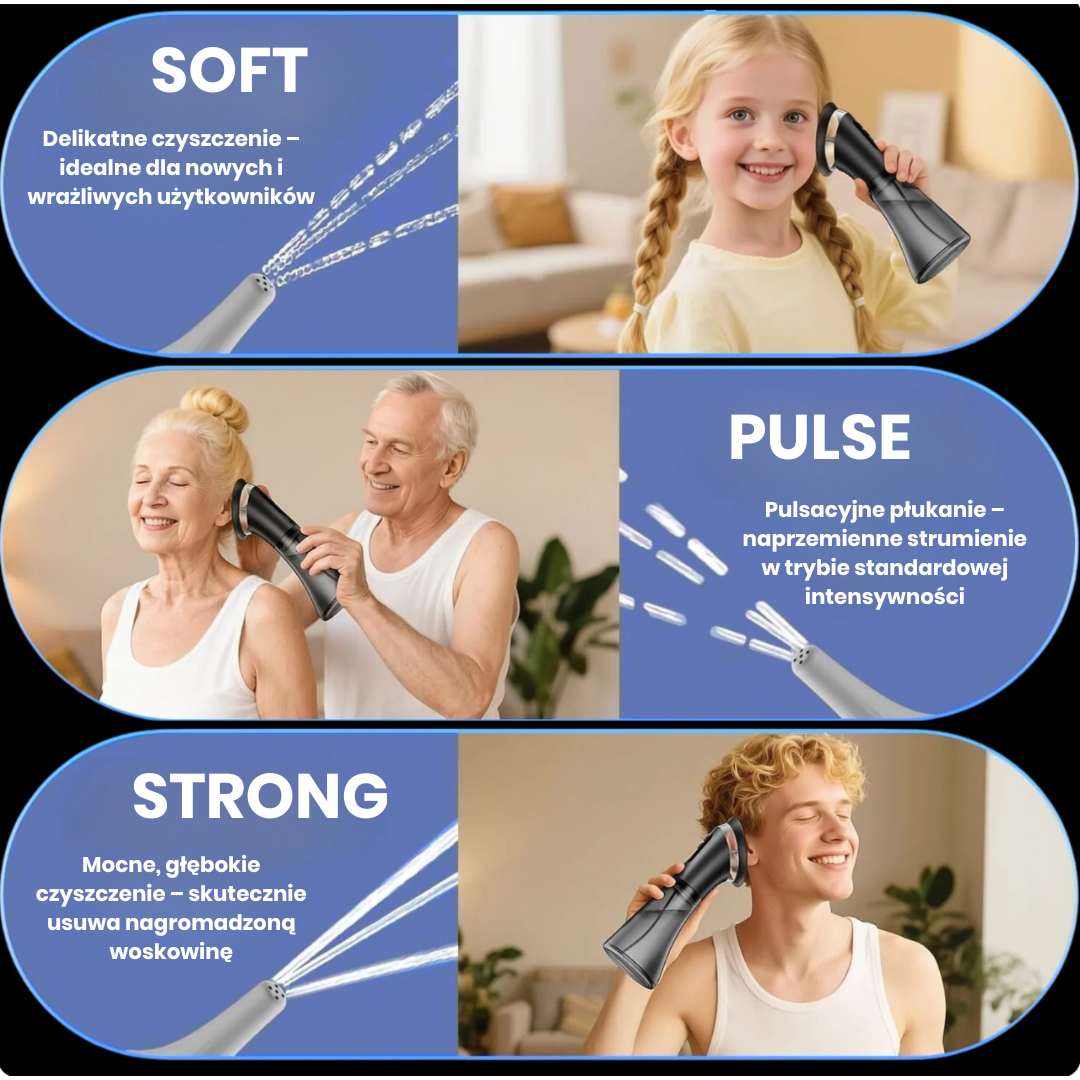 Urządzenie zostało zaprojektowane tak, aby dostosowywać ciśnienie wody do wrażliwości ucha, oferując 3 poziomy intensywności: Delikatny, Pulsacyjny i Mocny.