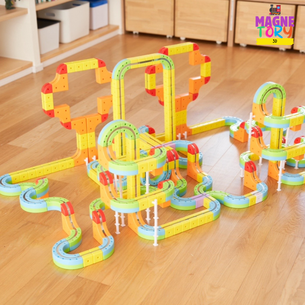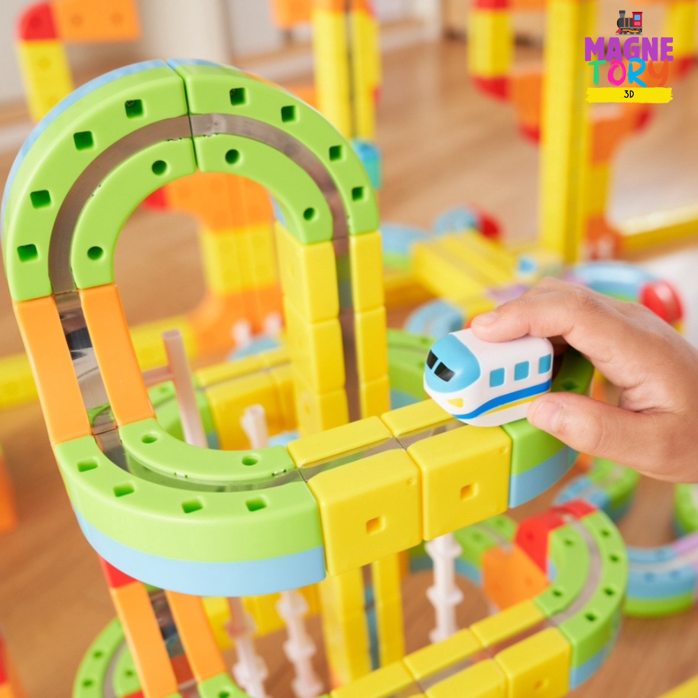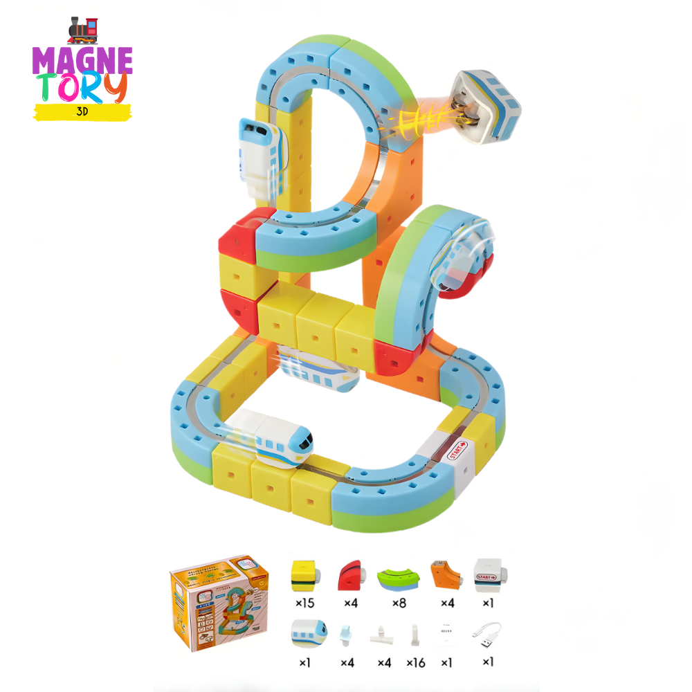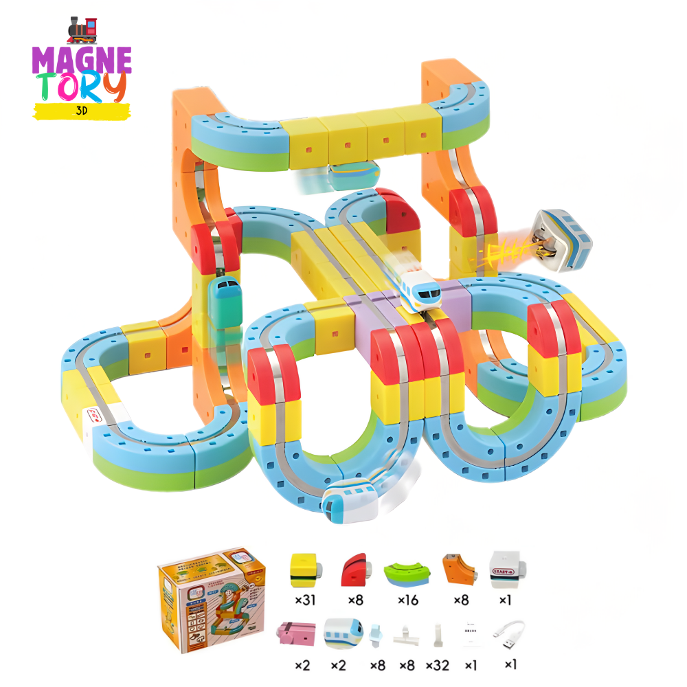 Twoje dziecko z łatwością stworzy własny tor magnetyczny — bez skomplikowanych instrukcji, śrubek czy narzędzi.